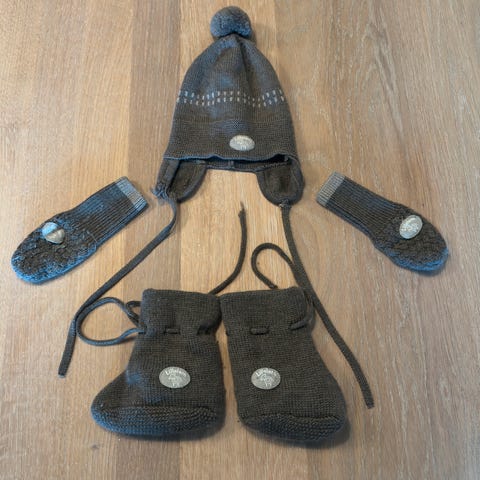Deilig balaclava med matchende votter og sokker/tøfler til.