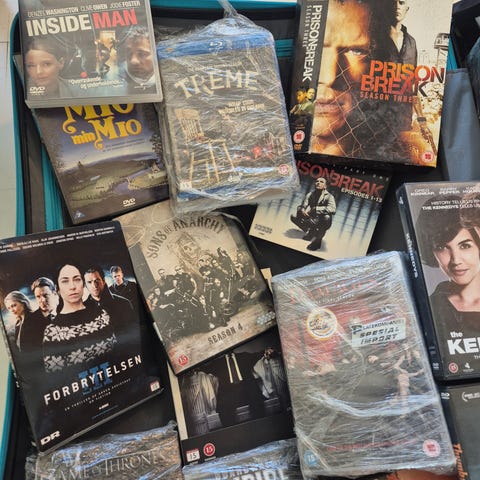 DVD-filmer med ulike titler og sjangere. Inneholder flere filmer i standard DVD-format. Selges samlet 150kr