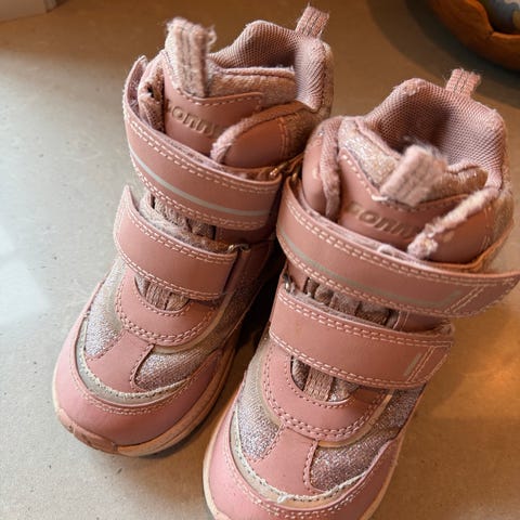 Glitrende, funklende rosa vintersko selges. Det er tydelig at de er brukt, men det er veldig mye bruk igjen i dem også. Ingen feiler eller mangler. Brukt en halv sesong, så ble de for små. Gode og varme. De ble ekstra varme fordi de glitret fikk jeg beskjed om.