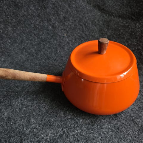 Flott kjele i retro, vintage look. Materialet er keramikk, porselen eller noe slikt. Retro 70-tallsfarge på lokket. Løst tre-håndtak som enkelt kan byttes eller fikses. Kan sende, men best om du henter.