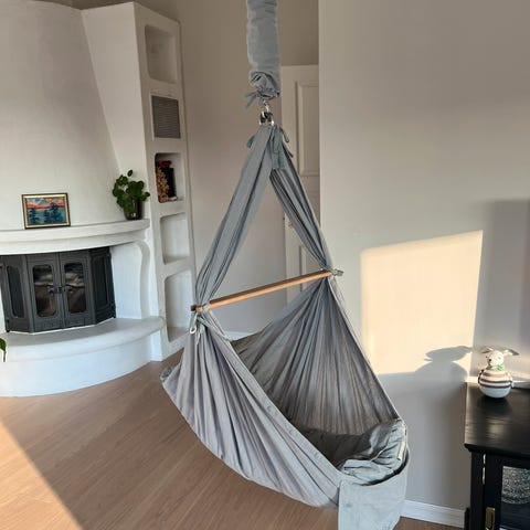 Moonboon-vugge med stativ. Merker på håndtaket i tre, men ellers fin og flekkfri. Den har vært vasket flere ganger av oss.