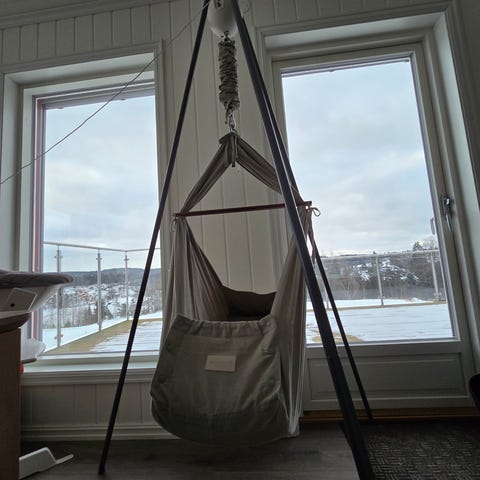 Det følger med fast madrass, tisselaken og oppheng til dørkarm.