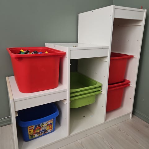 IKEA barnemøbel oppbevaringsenhet med flere nivåer og grønne plastbokser. Enheten består av tre trinn med tilhørende plastbokser i grønn farge, egnet for organisering og oppbevaring av barneleker eller annet smått materiale.