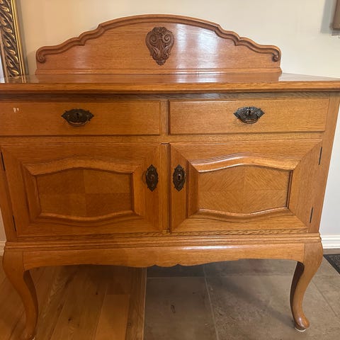 Solid skjenk. Trolig kjøpt i USA. Fremstår i god stand. Skuffer og dører glir lett. Ett par riper/merker på topplaten.