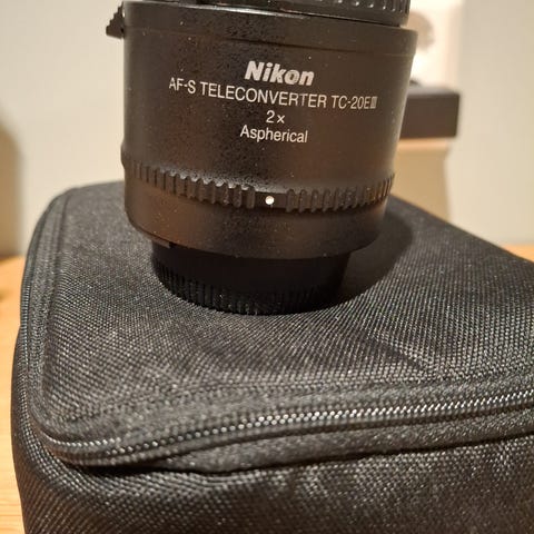Nikon TC-16A telekonverter med 1.6x forstørrelse. Objektivet er laget i Japan og brukes til å øke brennvidden på kompatible Nikon-kameraer.