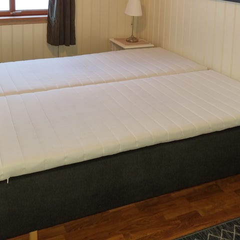 Innlegg til skille mellom madrassene følger med + festebeslag under til å holde sengene sammen.
