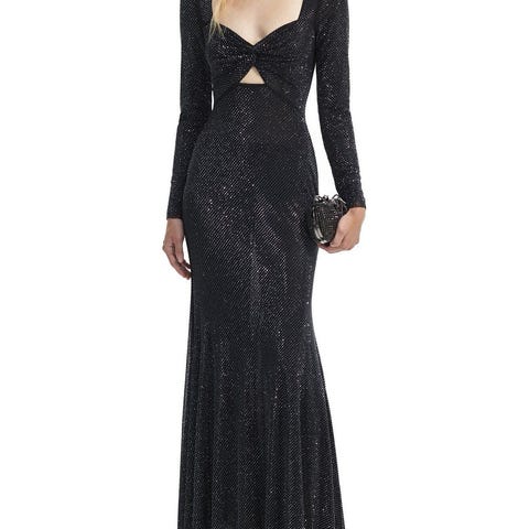 A head-turner if we've ever seen one, this dress is cut from square rhinestone-studded black mesh for a sensual, body hugging finish. It has long sleeves and is fitted throughout to spotlight your curves before flowing down to a flared midi skirt.