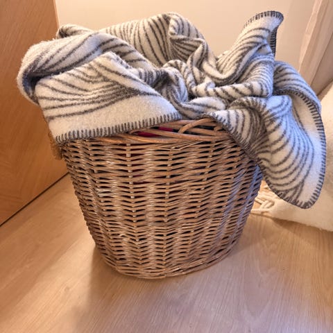 Kurv fra Zara Home - perfekt til oppbevaring av pledd, leker osv. Diameter er 58 cm uten hanker, høyde 21 cm. En liten skade på ene hanken, ellers i god stand. Nypris 899,-.
