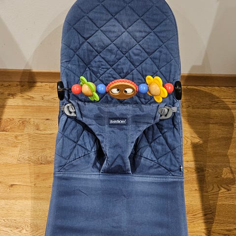 Babybjörn vippestol med leke. Trekket kan brukes begge veier: enten sort eller hvitt/grått.