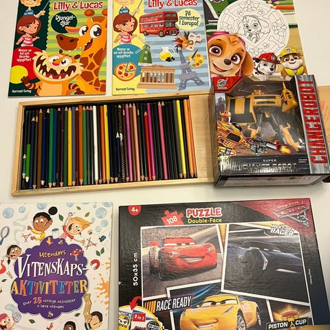 Forskjellige aktivitets leker og en aktivitetsbok.