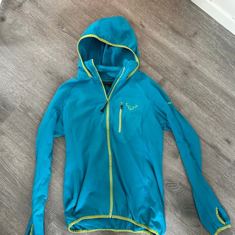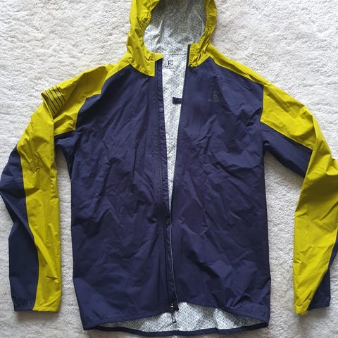 Gore løpejakke for menn i størrelse S. Jakken har en kombinasjon av gul og blå farge og er designet for løping.