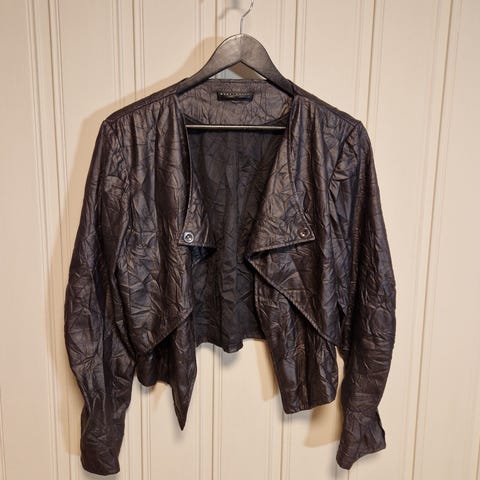 Okergul kåpe/ jakke i imitert semsket skinn ifra Wearhouse.