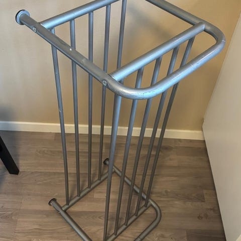 IKEA garderobestativ med svart metallstativ og marmorbase. Har flere opphengskroker med metallkuler for oppheng av klær og tilbehør.