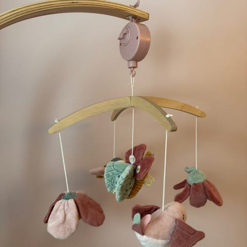 uro med myke figurer, designet for å festes på barnevogn eller sprinkelseng. Spiller beroligende musikk.