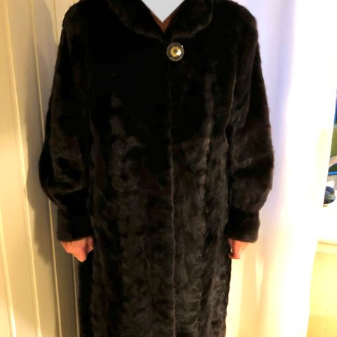 Selger en meget pent brukt pelskåpe lagd av mink haler. Lekker og stilig kåpe. Merket med "Johanne Fyhn" og "Grüstein product, Finland". Stilig mønster i pelsen, og lommer på sidene. Passer en M/L.