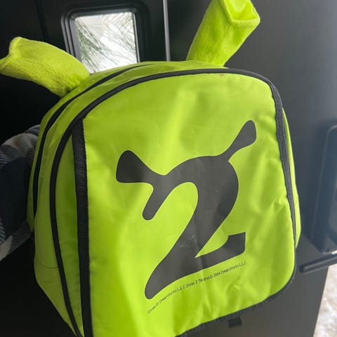 Shrek 2 ryggsekk i grønn farge med flere tilbehørsartikler inkludert lue, nøkkelringer og andre små gjenstander. Settet inneholder ulike Shrek 2-merchandise elementer i matchende grønn nyanse.