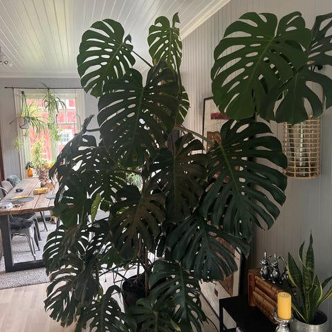 Monstera plante med store grønne blader. Egnet som innendørs dekorasjon. Krever moderat lys og vedlikehold.