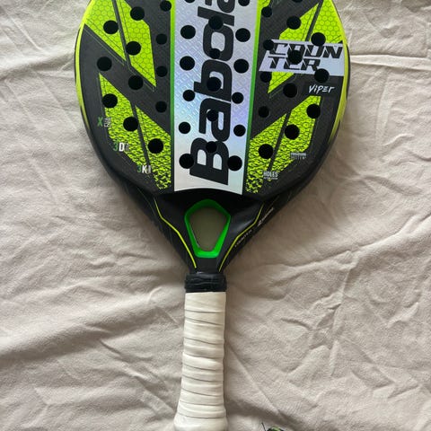 Babolat Viper Carbon padlepadelracket med deksel. Racketen har et hullmønster på treffområdet og er designet for padelspill. Dekselet har Babolat-logo og beskytter racketen ved oppbevaring og transport.