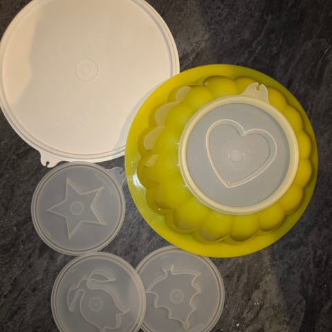 Alt tilbehør følger, 4 ulike mønsterlokk, oppbevaringslokk og serveringsfat. Helt og pent.