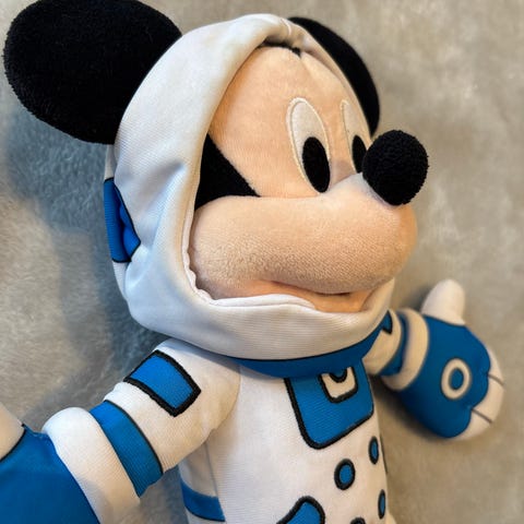 Disney Mikke Mus baby kosedyr i mykt materiale. Lager ranglelyd. Kosedyret har klassisk design med røde shorts, gule sko og hvite hansker. Passer som leketøy eller samlerobjekt.