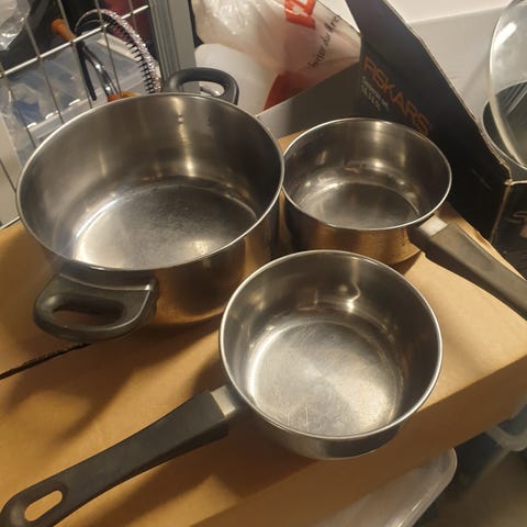 2 stk kjeler fra Modern House, Rix kolleksjon. Godt brukt og med teflonbelegg (begynt å løsne fra skruene på siden). Hele og kan fint brukes.
