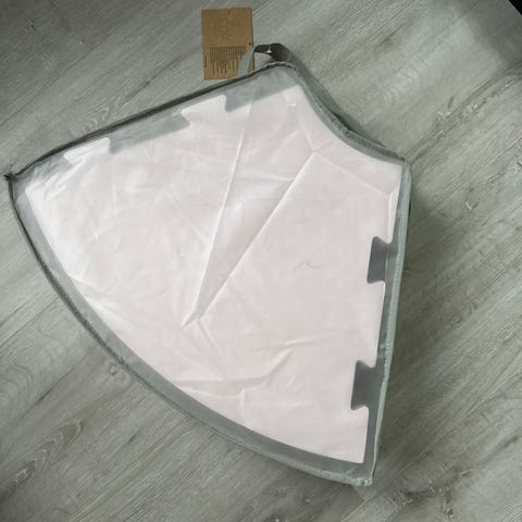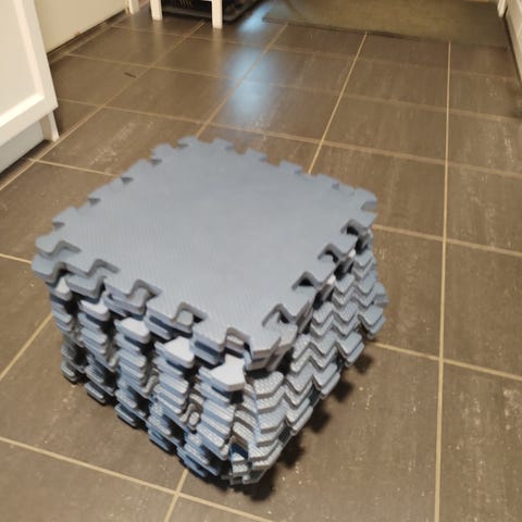 Lekematte puslespill med ulike former og farger, inkludert runde og trekantede deler. Materialet ser ut til å være skumplast, egnet for barn som lekeunderlag. Leveres i oppbevaringspose med glidelås.