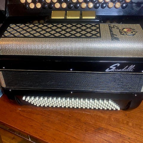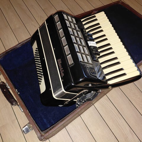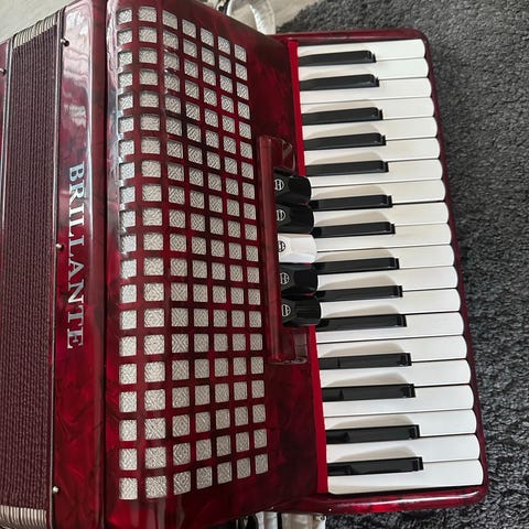 Marino trekkspill i rød og hvit farge. Instrumentet har tangenter og knapper for å spille ulike toner. Passer for musikere som ønsker et klassisk trekkspill.
