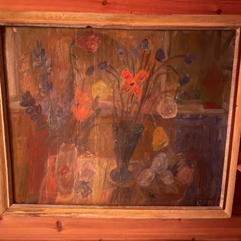 Usignert Hans Ryggen maleri på papp. Format 65x51 cm, krakelert.