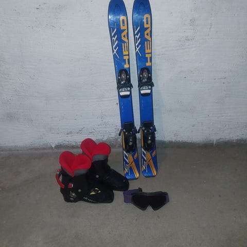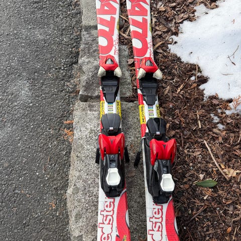 Atomic Race Race alpinski med rødt, hvitt og blått design. Skiene er utstyrt med bindinger og egnet for alpint bruk. Skiene har vært gode nybegynnerski , god carwing