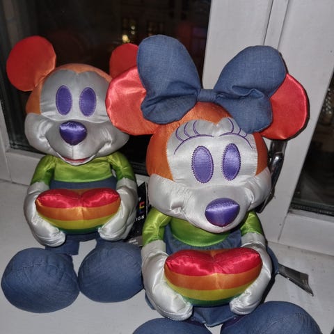 Disney Mickey Mouse kosedyr med rødt plagg med dekorative knapper og beige bukser i kordfløyel. Kosedyret har store svarte ører, hvite hansker og røde sko med hvite detaljer. Egnet som samleobjekt eller til dekorasjon. Fra Disney store 2016.