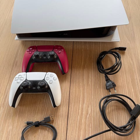 Lite brukt Playstation 5 spillkonsoll og alt originale utstyr til selges (1 dualsense kontroller, stativ til konsollen, HDMI, strømkabel og lade kabel til spake.)