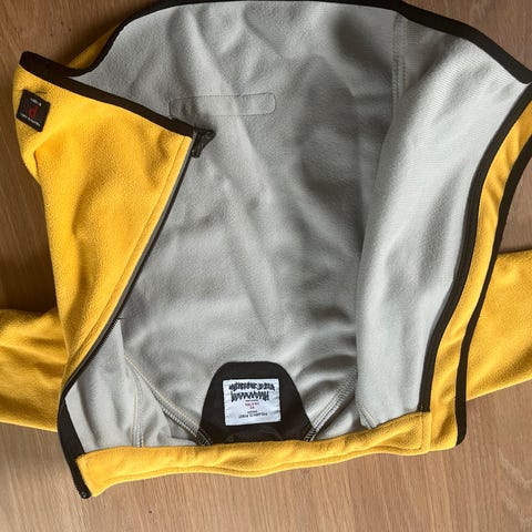 Skalljakke som jeg tror er mer vindtett enn vanntett. En stropp til glidelås er gått opp.