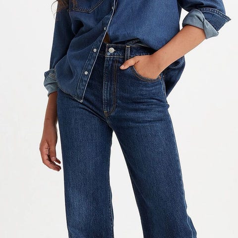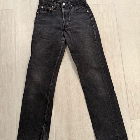 Levi's Denim jeans i blå farge, størrelse S med midjemål W29, lengde 97 cm, med avslappet passform, knappegylf og falmet vask. Jeansene viser tegn på slitasje, som lappete områder og frynser, spesielt nær mansjettene, noe som gir dem et vintage- eller slitt utseende. Dette var opprinnelig til stede da de ble kjøpt. De er i perfekt stand.
