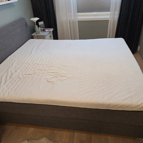 Jensen Kontinentalseng i grått stoff med størrelse 180x200 cm. Sengen har en polstret ramme og en høy ryggstøtte i samme stoff. Passer for standard dobbeltseng den er godt brukt men er ikke synlig flekker og ikke heller noe skade vil selge på grunn av flytting verdi til sengen 22000 men selger for 6000 pris kan diskuteres
