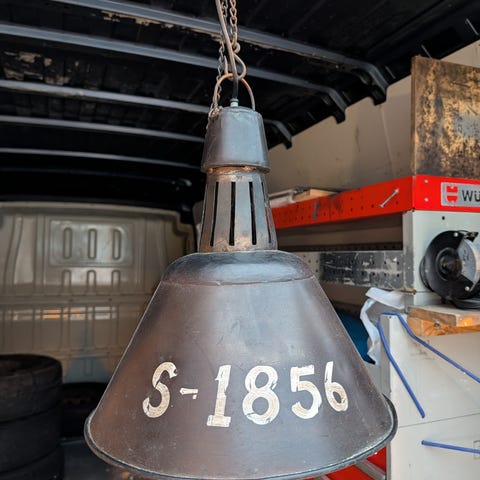 Lampen er i god brukt stand, men har noe rust/slitasje langs kanten nederst (se bilder). Dette er kun kosmetisk og gir lampen et autentisk vintage preg.
