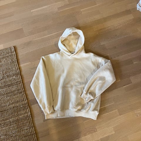 Genseren er beige og laget av bomull. Den har hette og en frontlomme, egnet for hverdagsbruk.