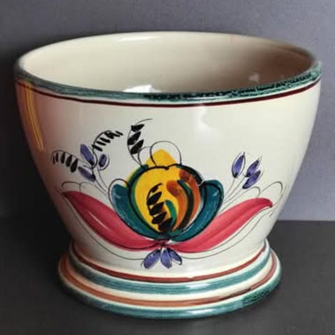 To flotte, eldre blomsterpotter i pen stand, uten nagg. Fastpris kr. 125,- pr. stk. De er ca 11,5 cm høye og ca 17 cm i diameter øverst. De er lettere krakelert i bunnen. Selges kun samlet til fastpris kr. 250,-.