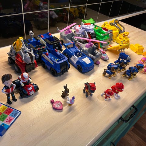 13 Paw Patrol lekebiler og 16 figurer i ulike størrelser og farger.