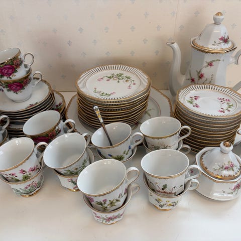 Porselensservise med blomstermotiv og gullkant