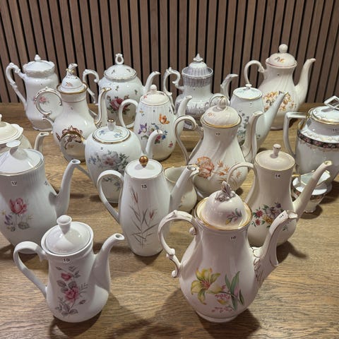 Porselensservise med blomstermotiv i flere farger og detaljer i gullkant. Inneholder ulike deler som tekanne, skåler, vase, krus, krukke og fat. Passer til dekorasjon eller servering. Tysk porselen fra Hutschenreuther, Tirschenreuth. Alt er håndmalt av Åse Sandvik. Selges samlet for 2000 kr, men prisen kan diskuteres. Hentes på Ridabu.