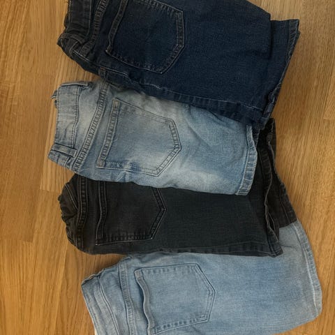 Deretter er det fire lin-shortser fra HM str 128. Den med striper er lagt opp med få sting, så den har samme lengde som de tre første. Kan fint fjernes.