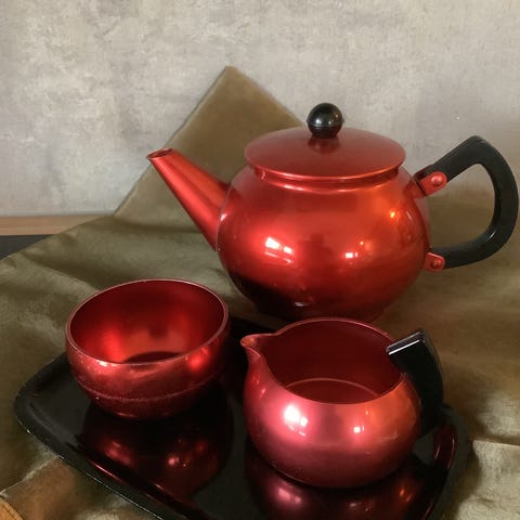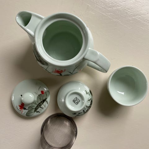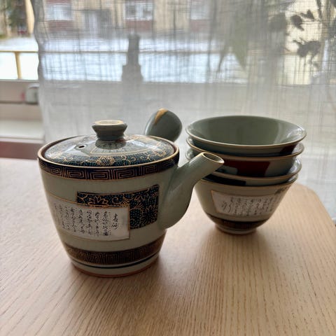 Keramisk tesett i japansk stil. Tekannen har et håndtak av tre.