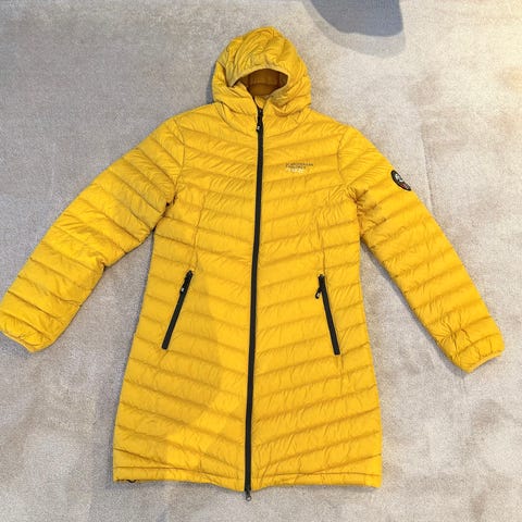 Scandinavian Explorer dunjakke i størrelse M, rød farge. Jakken har hette og glidelås i front. Materialet er 90% dun og 10% fjær, egnet for utendørs bruk og sportstype Annet.
