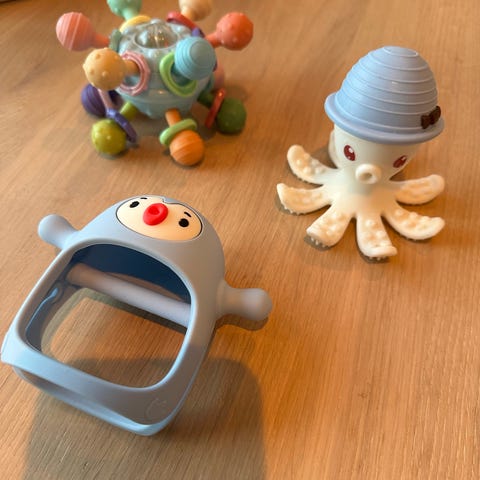 En søt biteleke til babyen , perfekt når de første tennene vokser ut. Den grepsvennlige biteringen består av forskjellige former og teksturer som er deilige å bite i, og leken har fargeglade mønstre som stimulerer de små barnas syn!