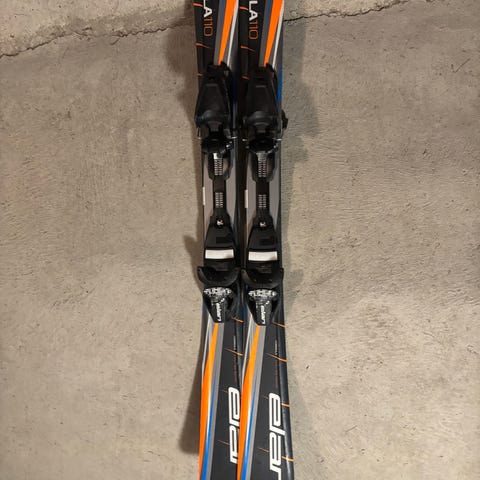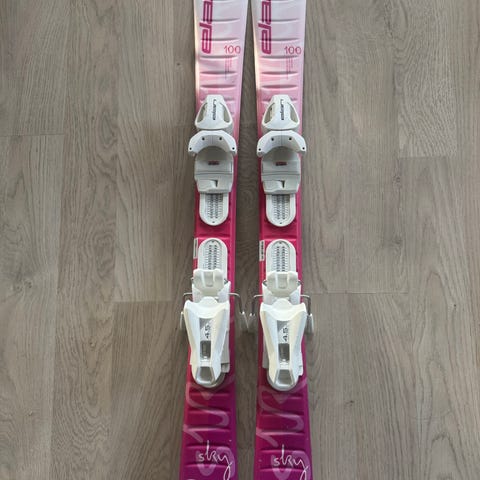 Elan Sky 110 alpinski med bindinger og staver. Skiene har en lengde på 110 cm og er i fargene rosa og blå. Staver type Leki 85 cm