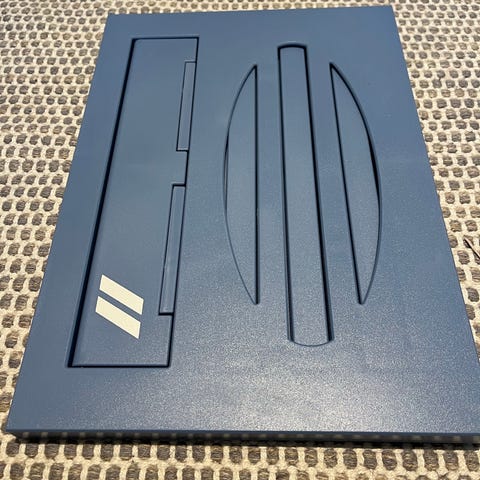 Herma bokstøtte/lesestativ i blå metall. Designet for å holde bøker oppreist på en stabil måte.