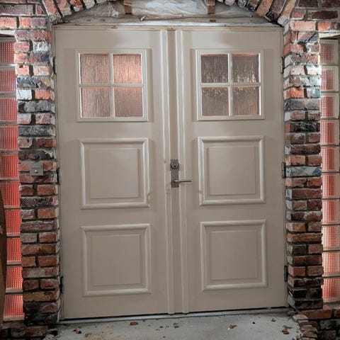 Hvit innerdør med karm, laget i tre, med klassisk fyllingsdesign. Døren er montert i karm og har plass til standard dørhåndtak og hengsler. Egnet for innvendig bruk i bolig eller kontor.