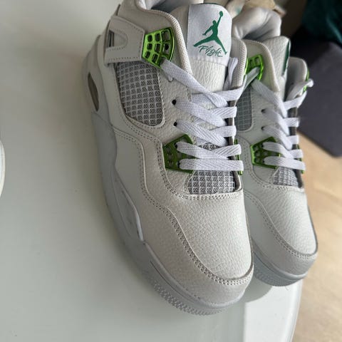 Jordan 4s i størrelse 44, retro. Skoene har klassisk design med detaljer i grått og rødt. Egnet for daglig bruk og annledninger