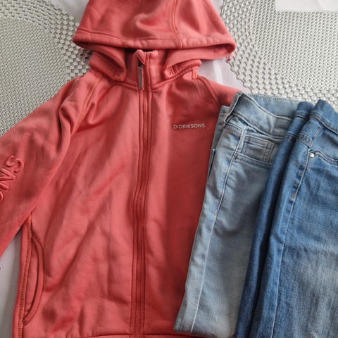 Hummel barneklær i størrelse 152 og 164 bestående av 4 joggebukser i ulike farger (blant annet lilla og blå) og en hvit t-skjorte med trykk.