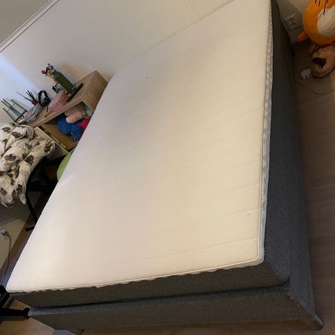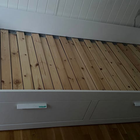 Lite brukt IKEA Brimnes seng med 2 skuff og 2 madrass i svart, 80x200 cm, kan trekkes ut til 160x200 cm.